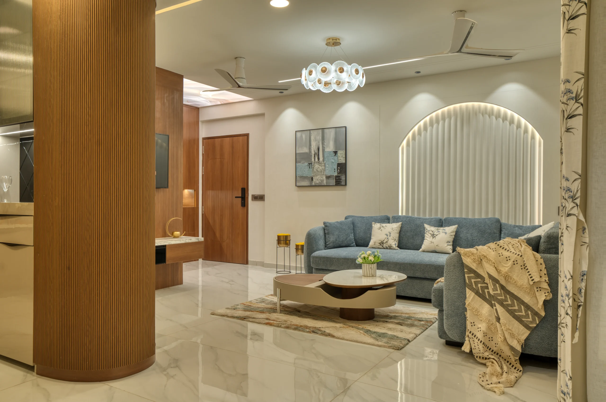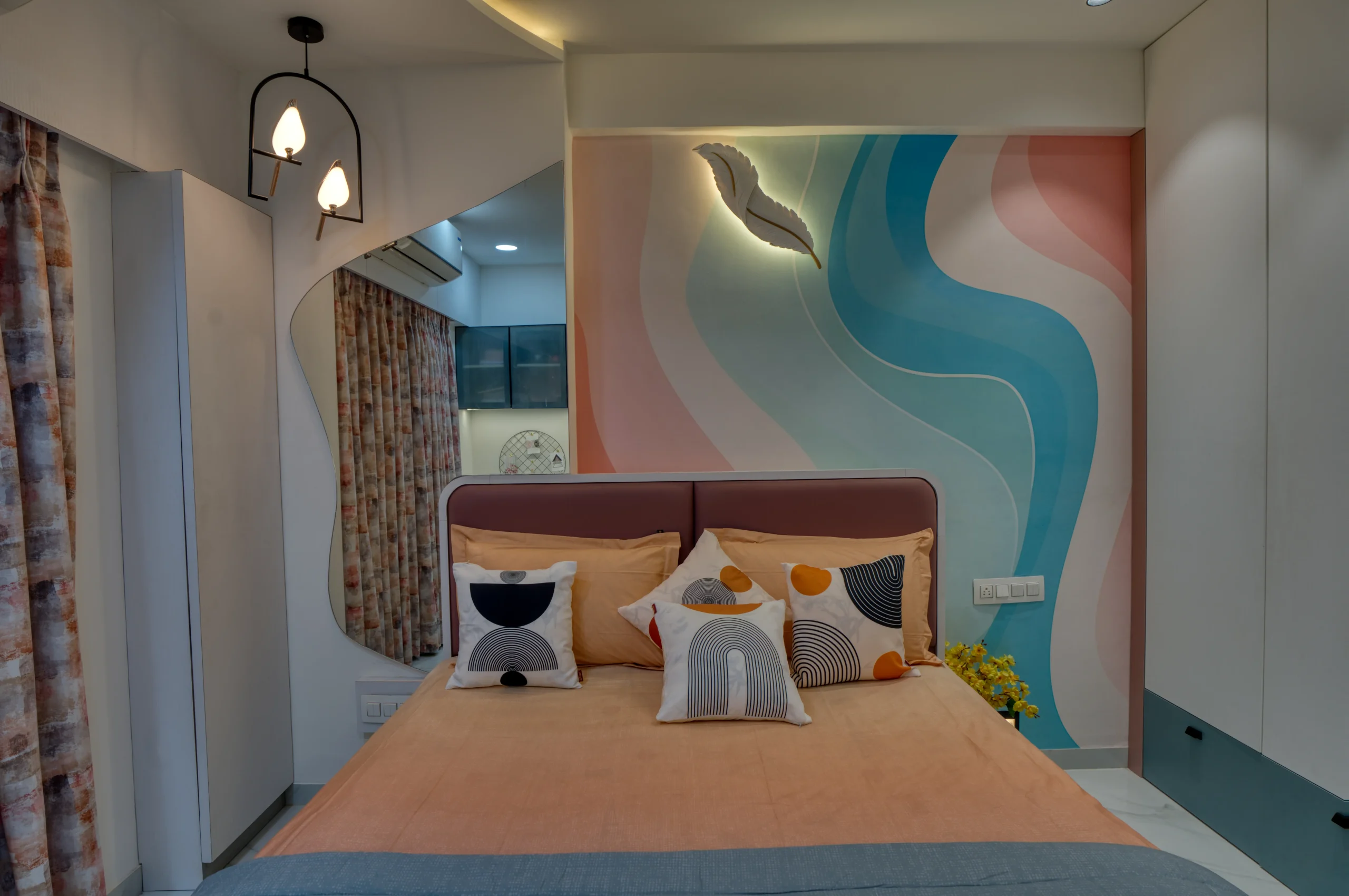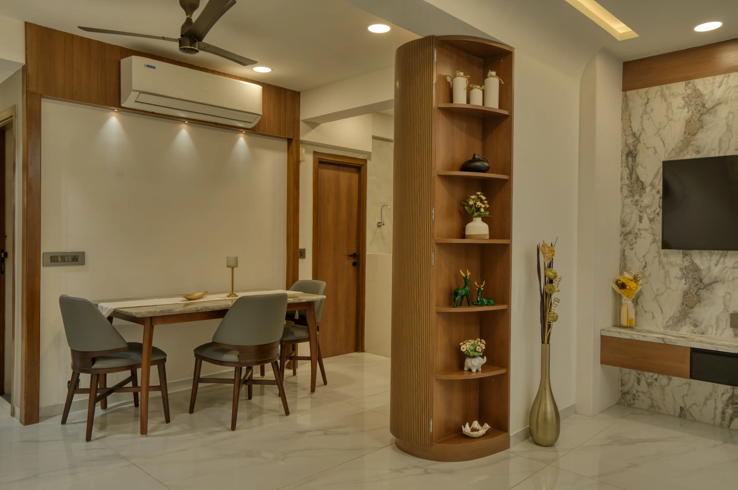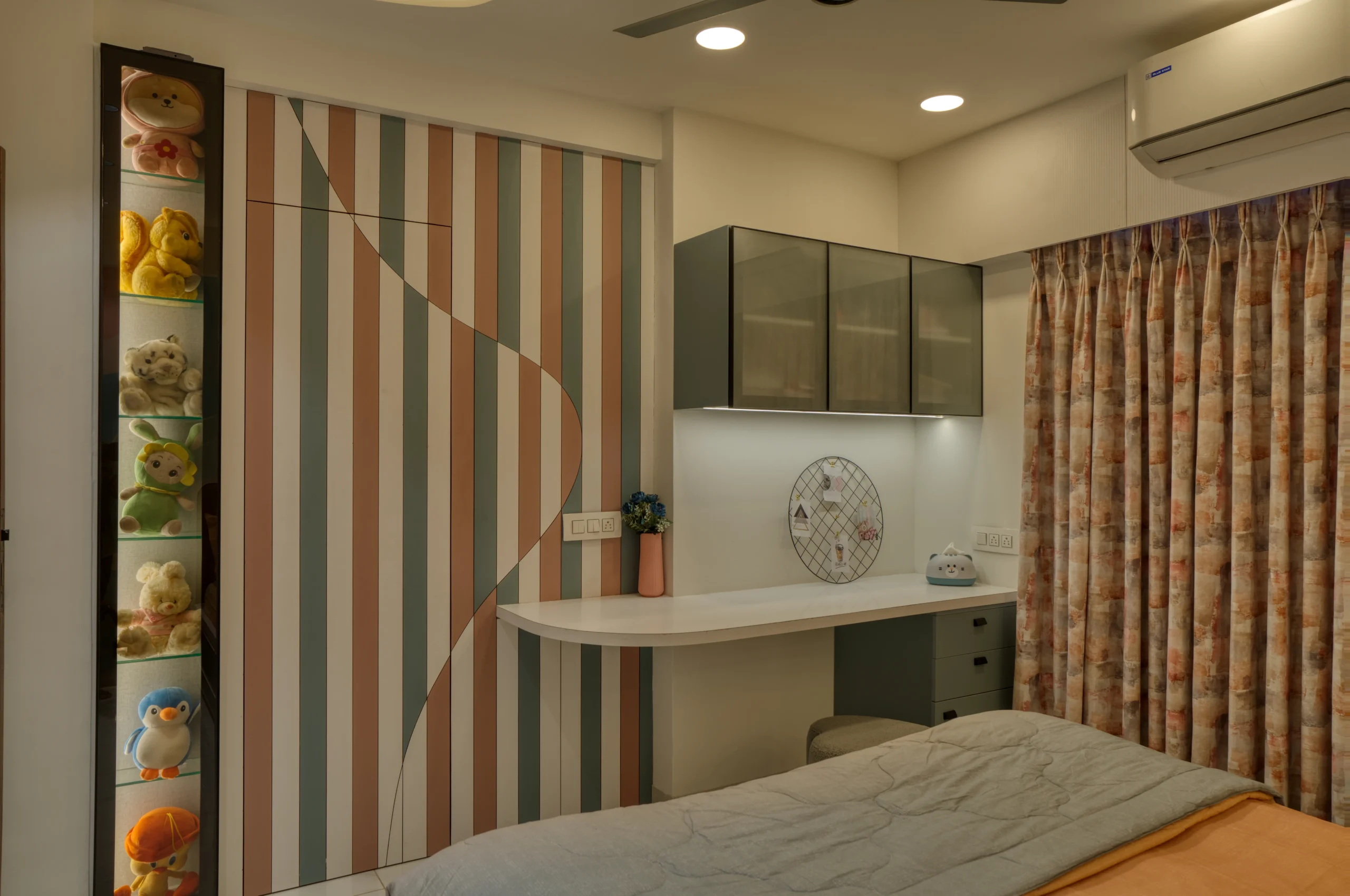 A residence that isn’t afraid to mix calm neutrals with bursts of colour and pattern. From fluted wooden columns to playful striped walls, every surface in this home has been treated as a design opportunity.