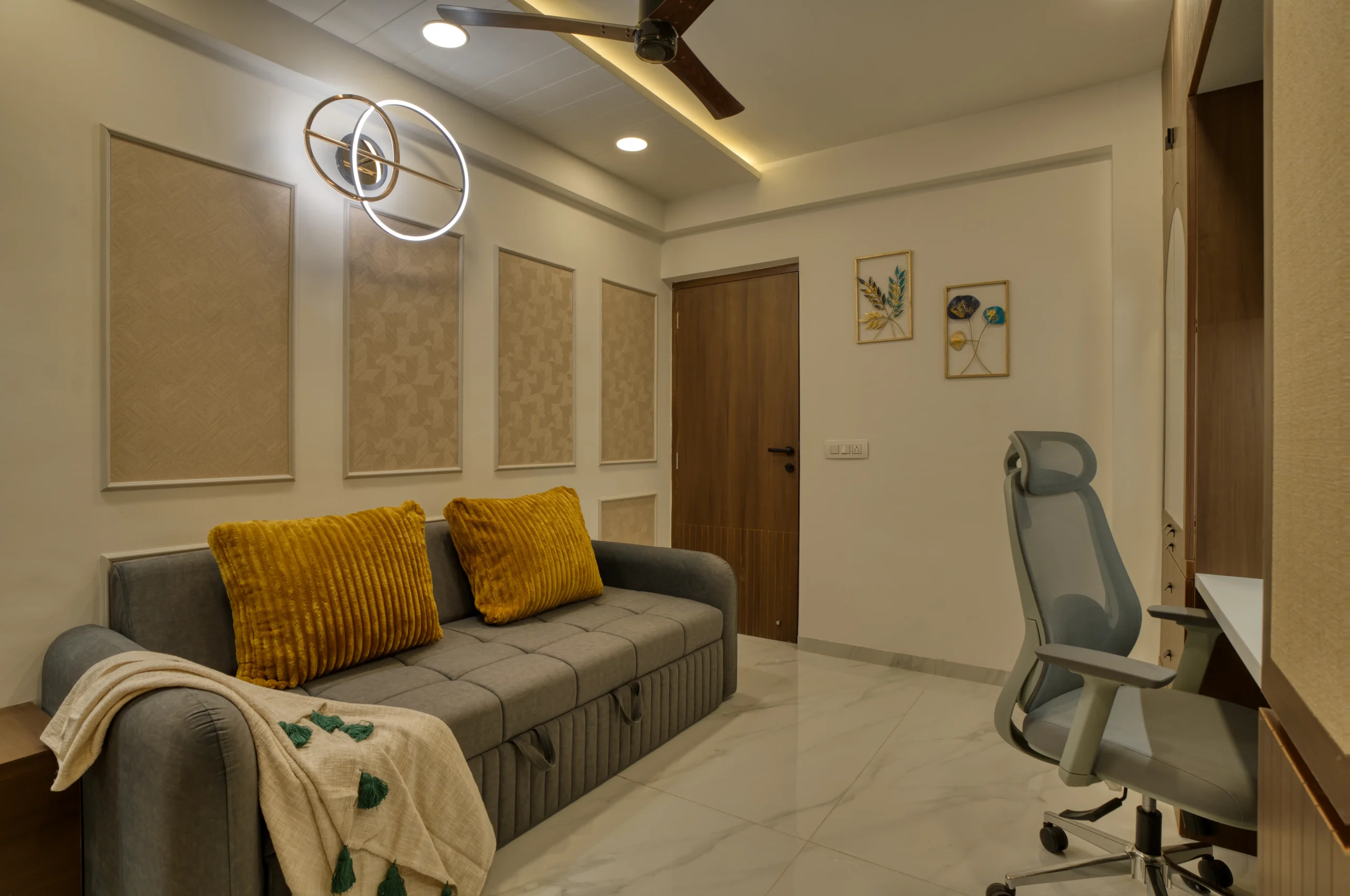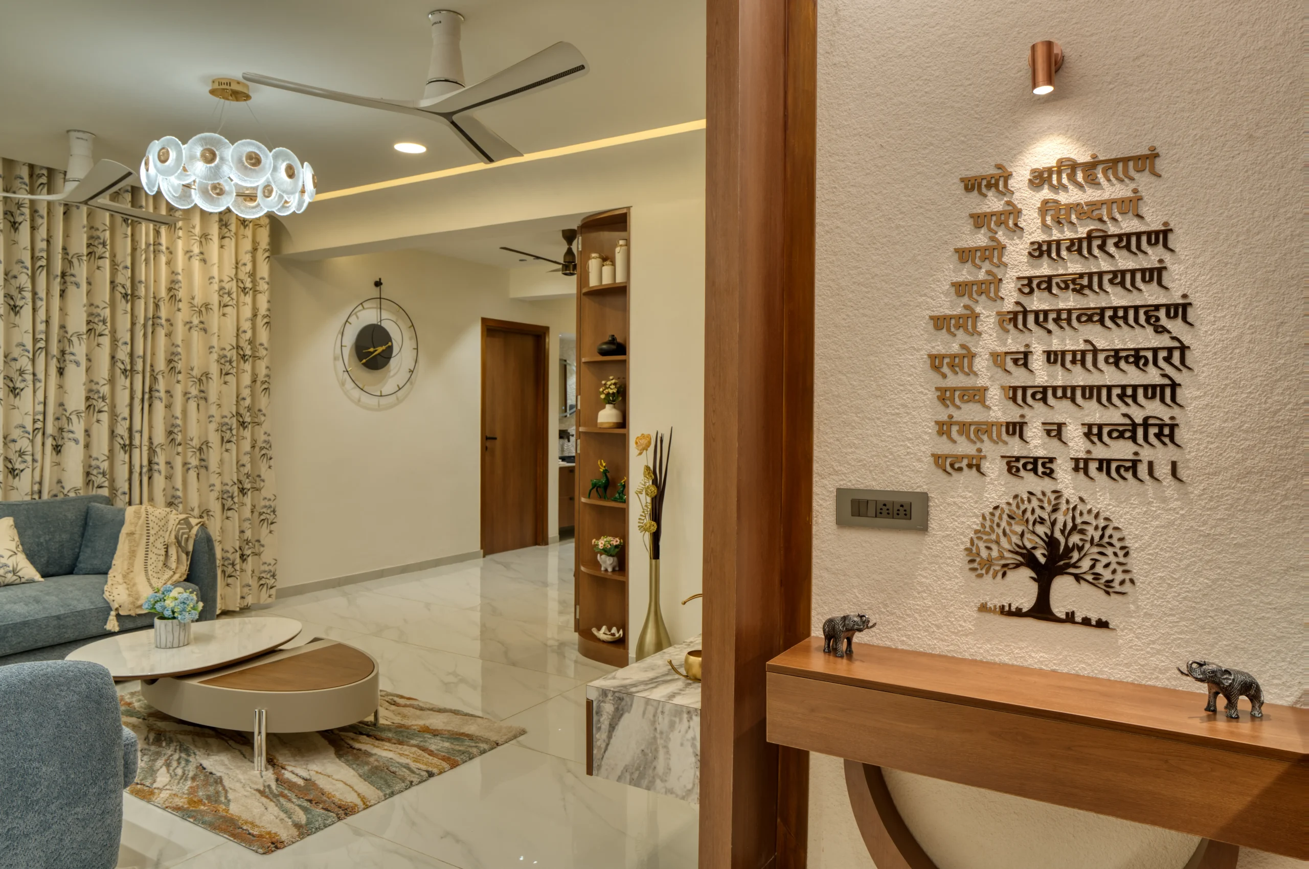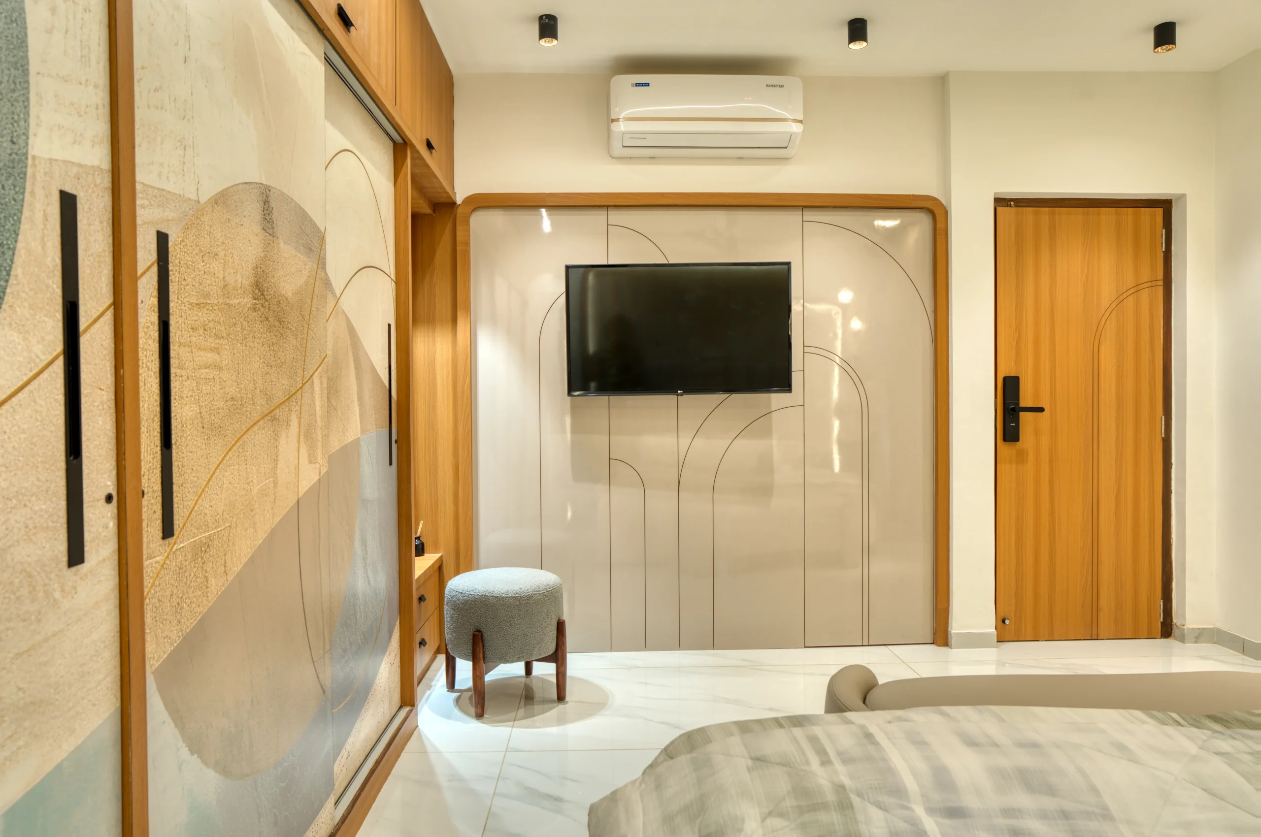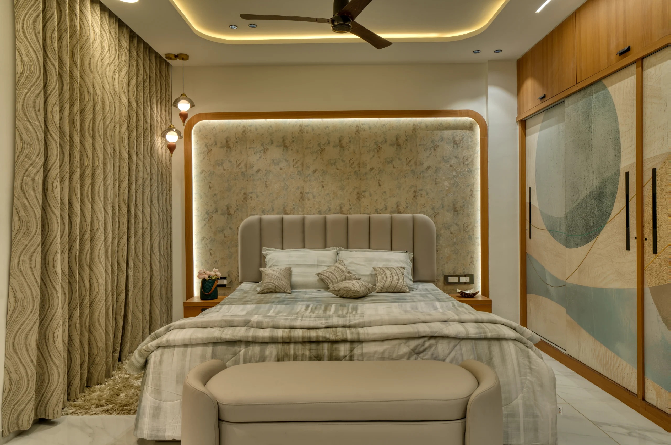 A residence that isn’t afraid to mix calm neutrals with bursts of colour and pattern. From fluted wooden columns to playful striped walls, every surface in this home has been treated as a design opportunity.